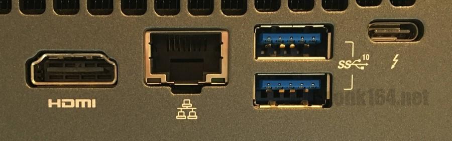 左からHDMI2.0a出力ポート、LANポート、USB-Aポート(上下で2つ)、USB-Cポート(Thunderbolt 3規格、DisplayPort1.2 Alt Mode対応)