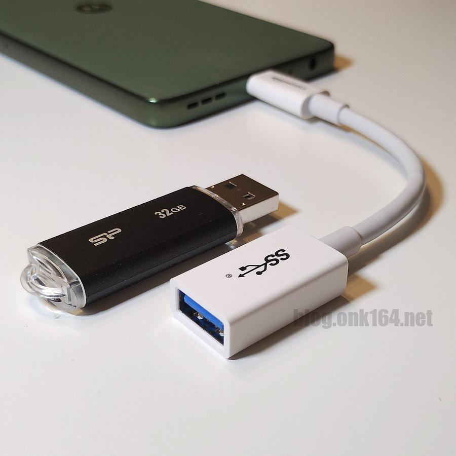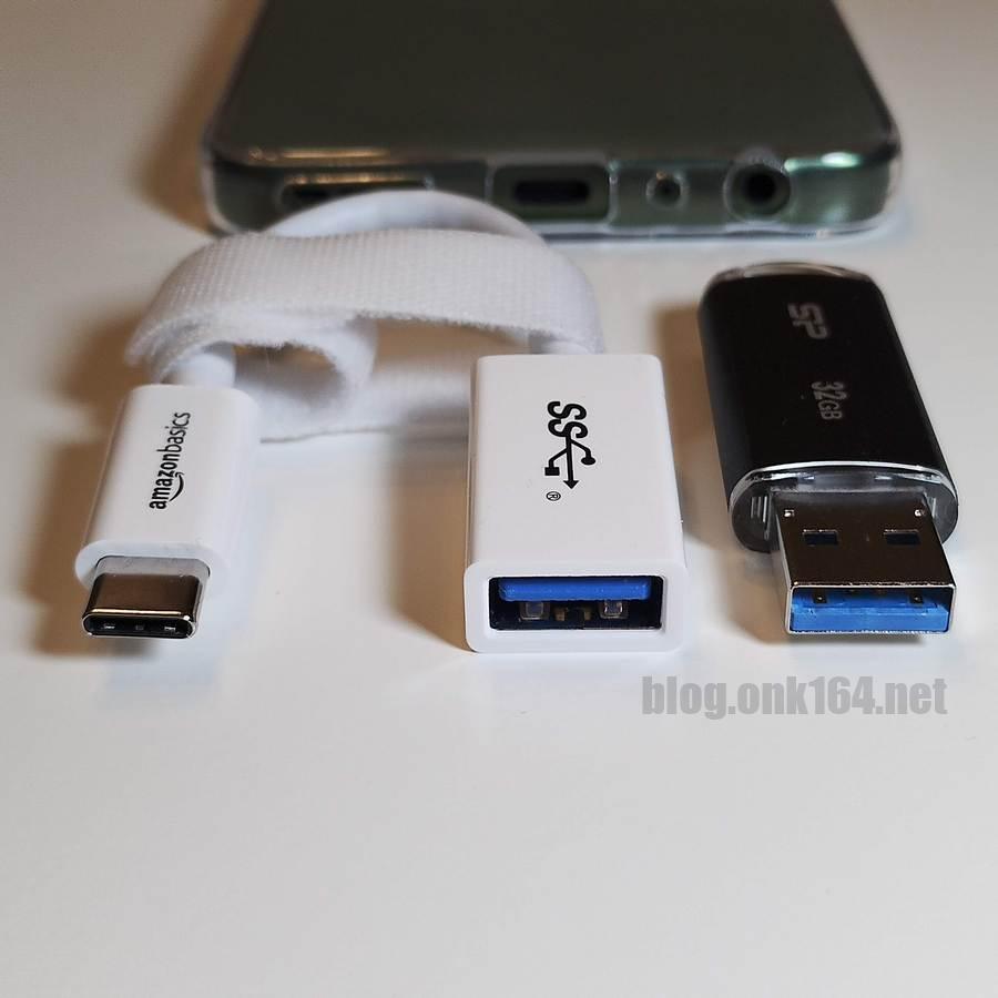 USBメモリーの端子形状がUSB-Aなので、変換アダプターを介してスマートフォンのUSB-Cポートに接続します。