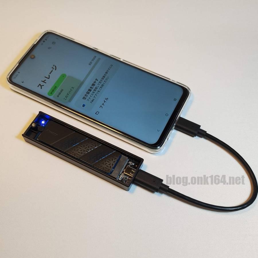 内蔵M.2 SSDと外付けケースの組み合わせで、スマートフォンからの電力供給(バスパワード)のみで使用出来ます。