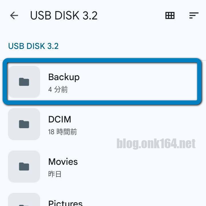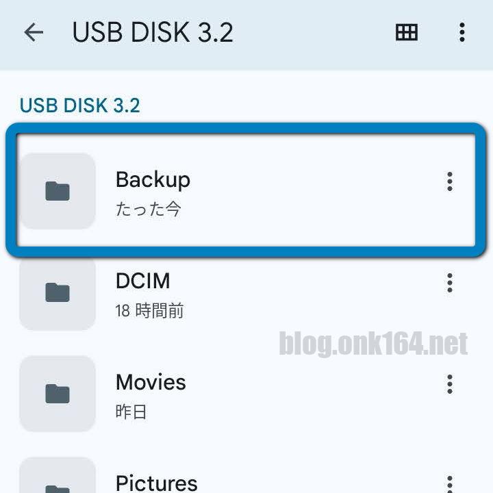 コピー元ファイルを、事前に作成したBackupフォルダー配下にコピーするので、Backupフォルダーをタップする。
