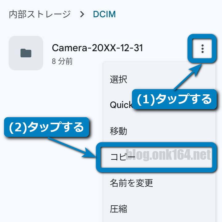 Camera-20XX-12-31フォルダー右側の︙をタップして操作メニューを開き、[コピー]をタップする。