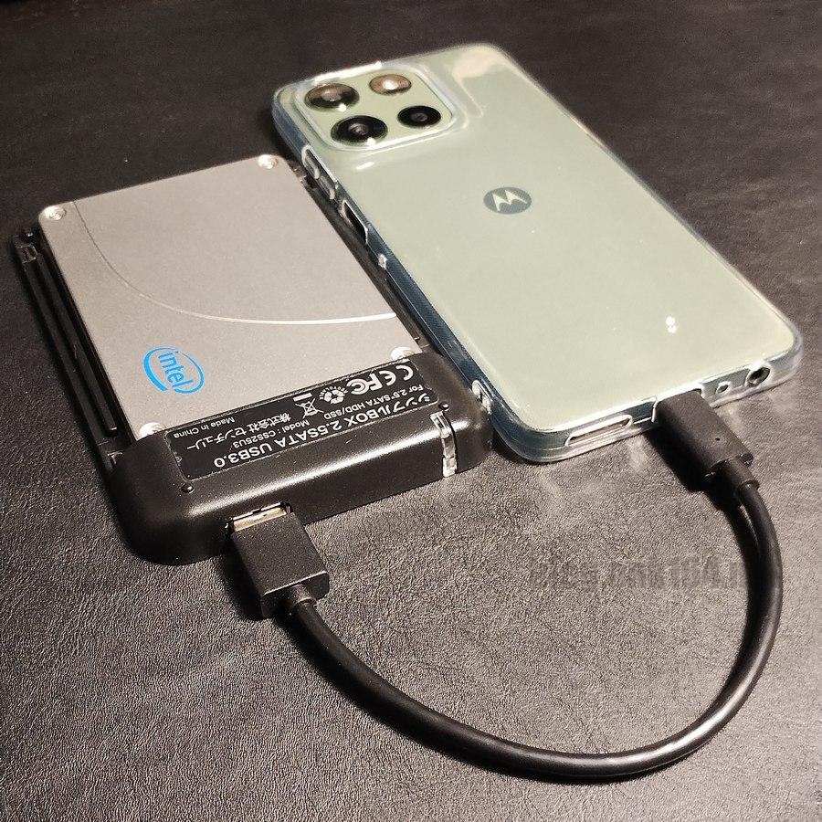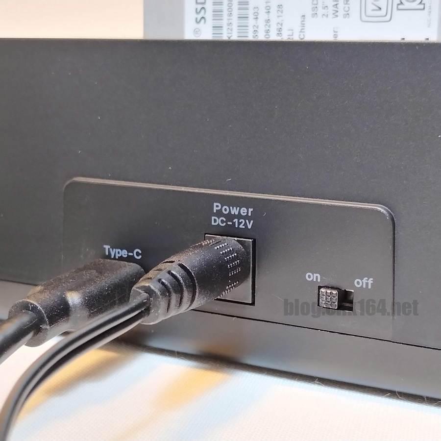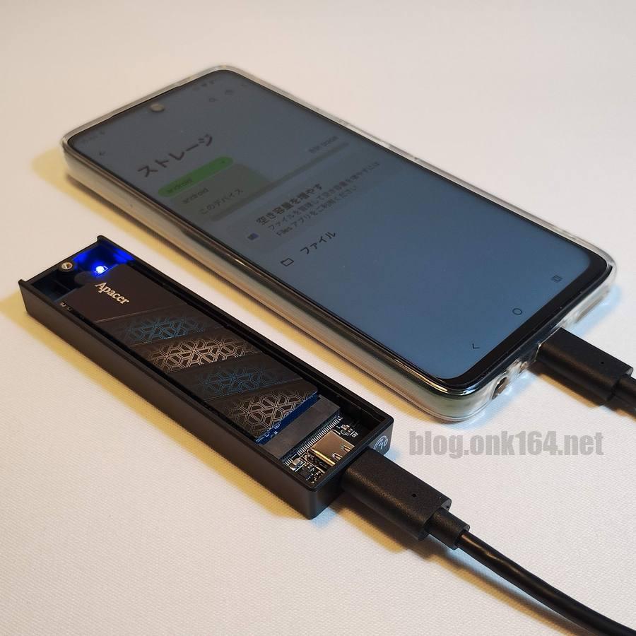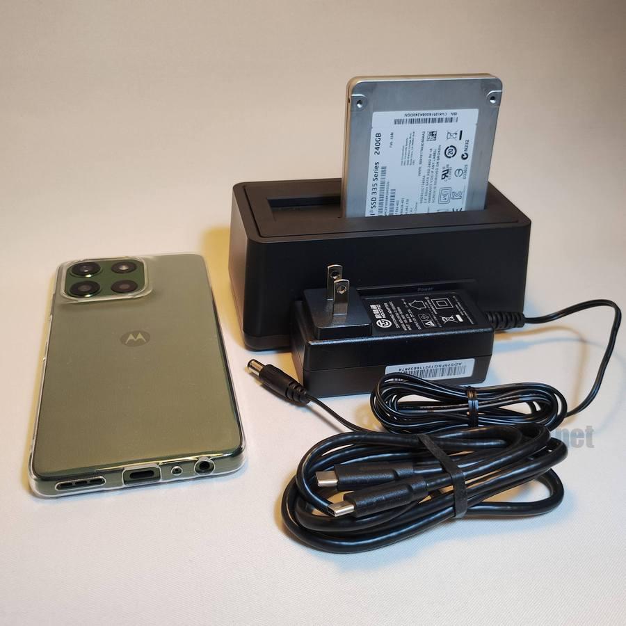 内蔵2.5インチSATA SSDは、バスパワードの外付けケースでは、スマートフォンからの電力では駆動しなかったため、セルフパワードの外付けスタンドに取り付けて別途電力を供給し駆動させました。