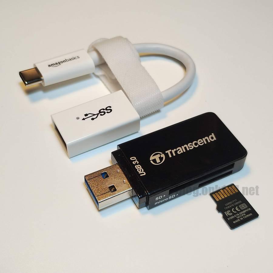 スマートフォンとの接続にはストレージに応じて、USB-C to USB-A 変換アダプター、SDカードリーダー、SSD外付けケースを使用しました。