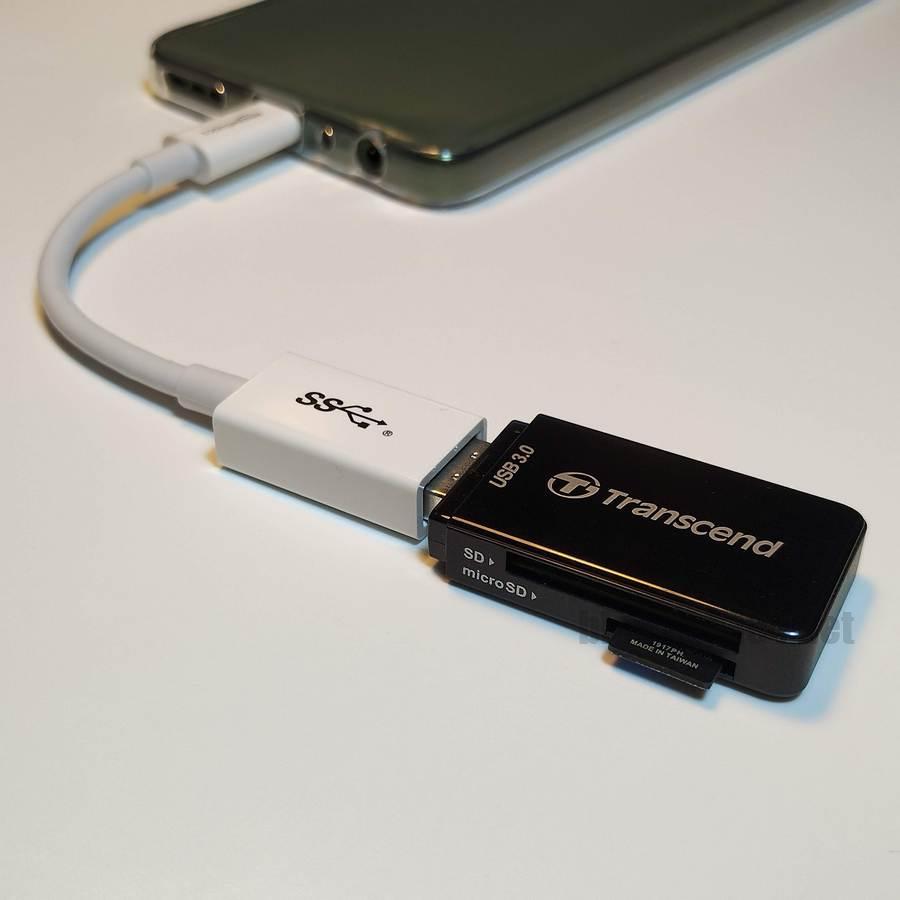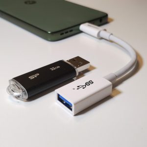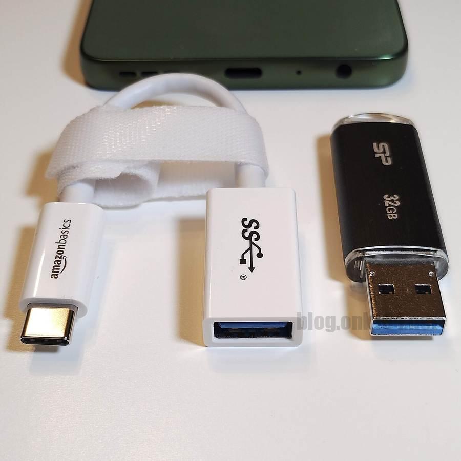 USBメモリーの端子形状がUSB-Aなので、変換アダプターを介してスマートフォンのUSB-Cポートに接続しました。