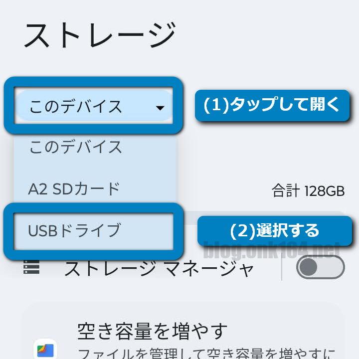 ストレージ一覧プルダウンメニューを開いて、USBドライブを選択する。