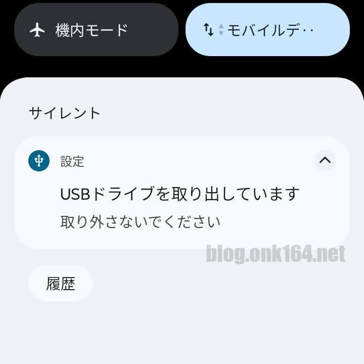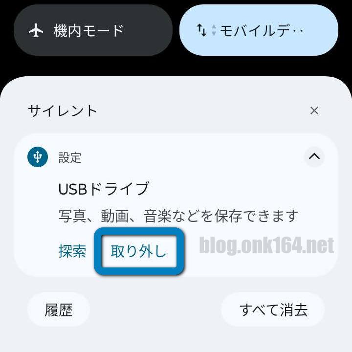 通知が消えたらスマートフォンからUSBメモリーを引き抜きます。
