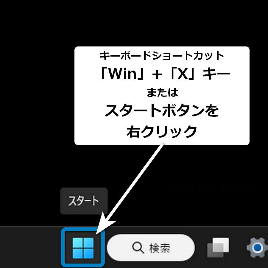 タスクバー左側にあるスタートボタンを右クリック、またはキーボードの「Windowsロゴキー」+「X」キーを押してスタートボタン コンテキストメニューを開く。