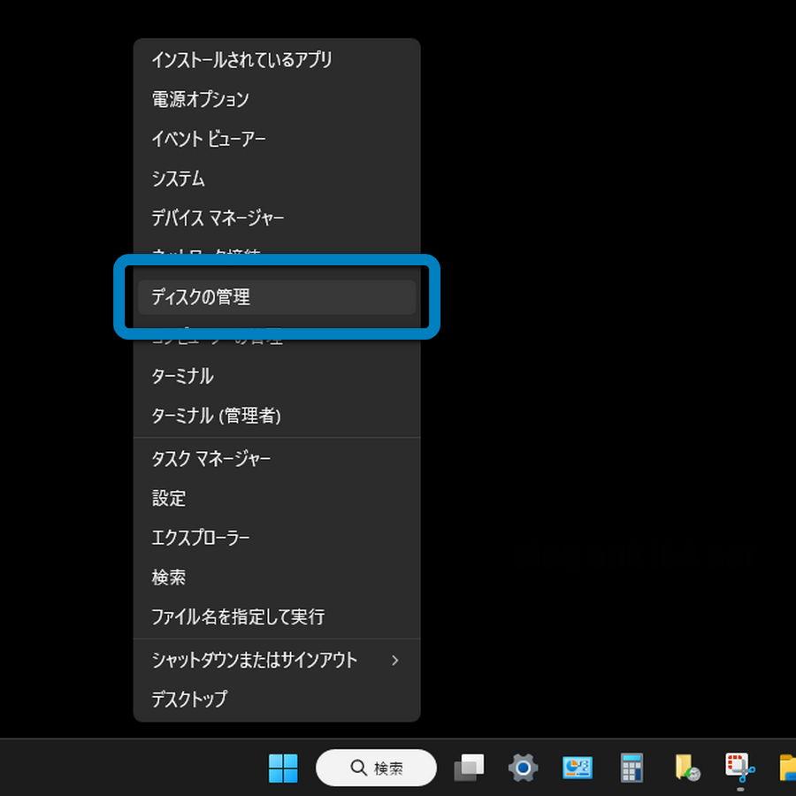 スタートボタン コンテキストメニュー一覧の「ディスクの管理」をクリック。