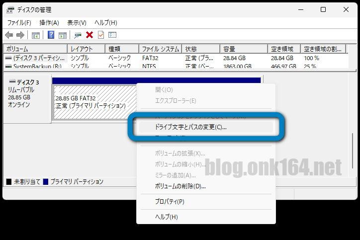 コンテキストメニュー一覧の[ドライブ文字とパスの変更]をクリックする。