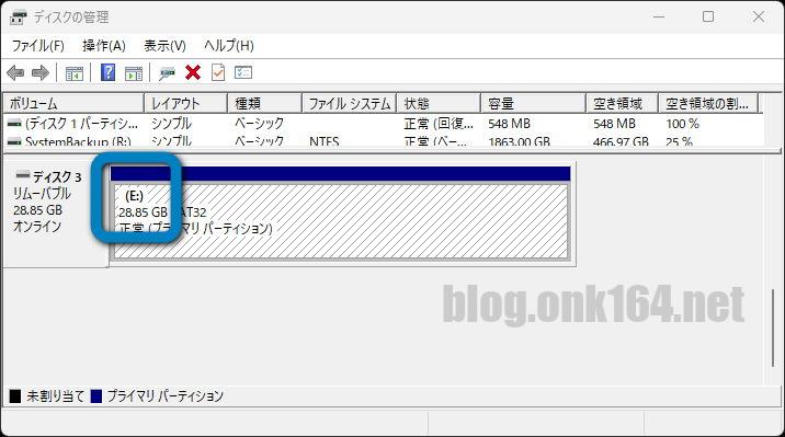 ディスクの管理画面で、FAT32形式でフォーマットされた容量28.85GBのボリュームが1つ存在しているということを確認できます。